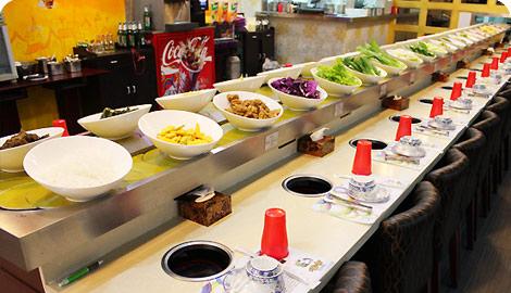 回轉(zhuǎn)火鍋的運輸帶上除了火鍋食材之外,還有其他小吃、水果、甜點、湯底等?;剞D(zhuǎn)火鍋店面裝修通常比傳統(tǒng)火鍋更為時尚,而顧客也有了更多的選擇性。食材放在運輸帶上的時間也相對較短,保證了食材的新鮮。通常在店內(nèi)有集中的調(diào)味臺和飲料機供顧客自行取用,調(diào)料種類有麻醬、沙茶醬、醬油、辣油、陳醋等數(shù)十種。回轉(zhuǎn)火鍋實現(xiàn)了傳統(tǒng)餐廳的人力服務(wù)到科技自動服務(wù)的跨越,節(jié)省了人力成本。